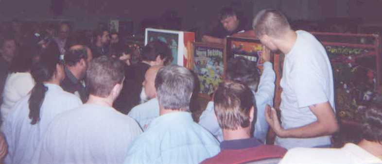 During the auction of the Jive Time ! Look at all those people bidding on the Jive Time. Don was showing off the fine operation of the game to make sure everyone knew it was workin' all the way. I told Don I had helped bid up the price, but there was no way I would have chanced taking that thing home in my car. It would have had to get the shop vac out the get all the paint out of the carpet. Adios Jive Time, Hello Jurassic Park at Don's house.